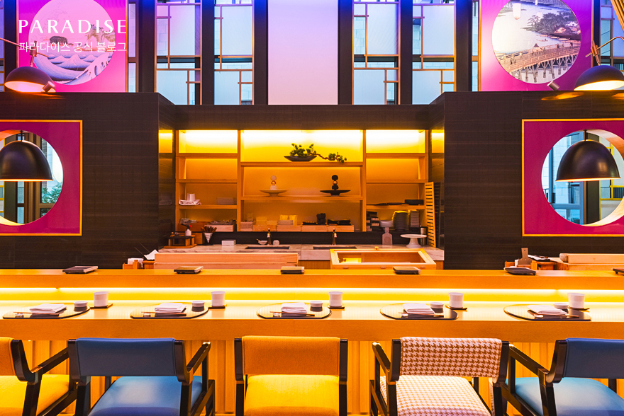 첫 번째로 소개할 신년 모임 장소 추천은 트렌디한 일식을 즐길 수 있는 파라다이스시티의 라쿠입니다. 라쿠는 다양한 장르의 일식을 창의적으로 재해석한 메뉴를 만나볼 수 있는 파인다이닝 레스토랑입니다. 모던한 베이지톤에 강렬한 색채 포인트를 입힌 인테리어로부터 느껴지는 세련된 무드는 신년 모임의 분위기를 더욱 고급스럽게 만들어 주는데요. 개별 룸도 마련되어 있어 프라이빗한 모임 장소를 찾고 있는 분에게도 안성맞춤입니다.