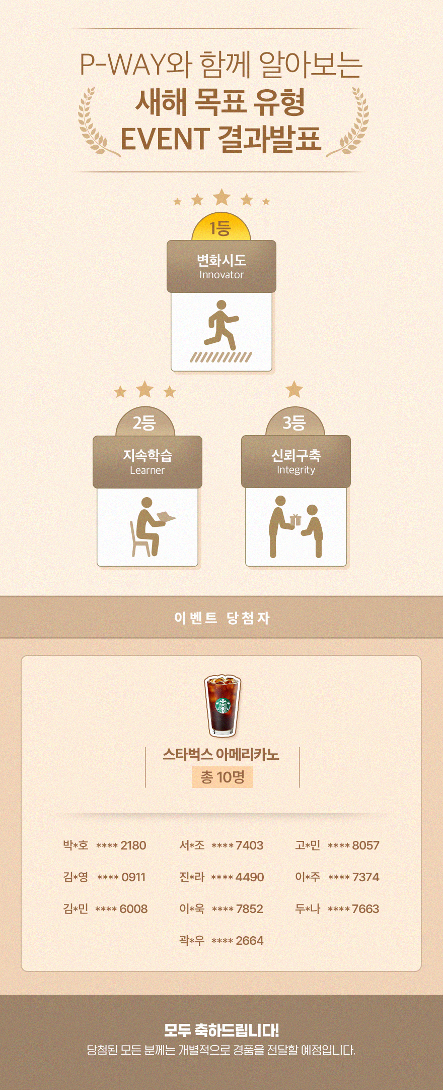새해를 맞이하여 파라다이스의 가치를 담은 P-WAY와 함께 ‘새해 목표 유형’을 알아보는 시간을 가져보았는데요. P-WAY 공유 가치 중 가장 많은 선택을 받은 파라다이스 웨이는 무엇이었을까요? 순위 공개와 함께 행운의 당첨 주인공을 지금 바로 공개합니다! 🎉