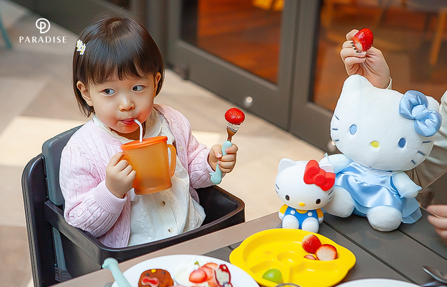 강 매니저 가족이 픽한 메뉴는 헬로키티 딸기 생크림 케이크와 헬로키티 갸또 바니유였습니다. 케이크와 바니유 모두 맛도 비주얼만큼 훌륭했는데요. 고급스러운 달콤함과 부드러운 맛으로 아이들도 부담없이 즐길 수 있었습니다. 파라다이스시티의 딸기뷔페에는 아이를 위한 유아용 의자는 물론 빨대컵까지 세심하게 준비되어 있어 더욱 편안하게 뷔페를 즐길 수 있었죠.