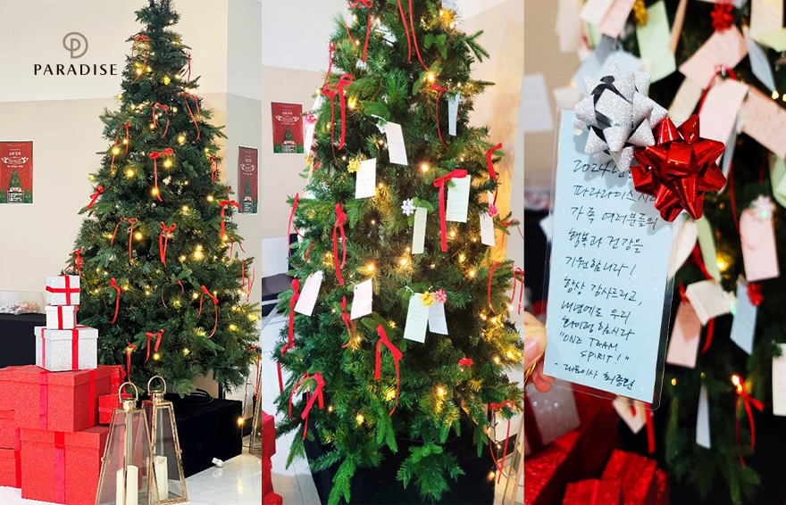 파라다이스시티가 임직원들과 함께 따뜻한 연말 이벤트를 가졌습니다. 이번 행사는 직원들이 직접 크리스마스 트리에 자신의 새해 소망과 격려 메세지를 적은 카드를 걸어 두는 방식으로 진행되었는데요. 고마운 동료들에게 감사의 마음을 담은 임직원의 진심이 모여 대형 트리가 형형색색의 카드들로 가득 채워졌습니다. 이벤트가 종료된 후에는 추첨을 통해 소정의 선물을 전달하며 소소한 기쁨도 나누었는데요. 앞으로도 파라다이스시티는 건강한 사내 문화 활성화를 위해 직원들과의 따뜻한 소통을 이어 나갈 예정입니다.