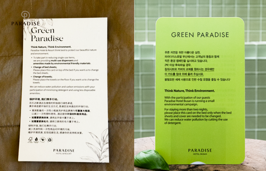 삶을 예술로 물들이는 아트테인먼트 리조트 파라다이스시티와 해운대 바다를 품은 파라다이스 호텔 부산은 객실 안팎으로 다양한 친환경 활동을 실천 중입니다. 우선 연박 투숙 고객을 대상으로 그린 카드(Green Card) 제도를 시행하고 있습니다. 고객이 침구와 타월을 교체하지 않고 사용하고 싶다면 그린카드를 활용해 의사를 표시할 수 있는데요. 자연스럽게 에너지와 세제 사용을 최소화하며 환경을 위한 움직임에 동참할 수 있죠. 객실 내에 대용량 어메니티를 비치해 일회용품 줄이기에도 앞장서고 있습니다.
