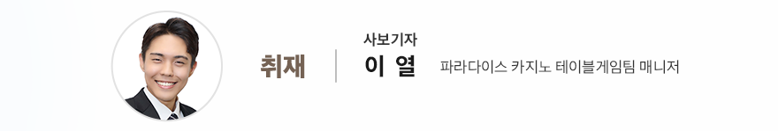 ‘내가 일하는 것을 모르게 일을 하라.’ 이한솔 매니저의 근무 철학입니다. 파라다이스 카지노의 팀들은 늘 화기애애한 분위기로 유명하기도 한데요. 이 매니저는 ‘파라다이스시티 카지노는 결국 즐거워야 하는 공간이므로 다 같이 즐거운 마음으로 근무해야 고객에게도 그 마음이 전해진다’며 자신만의 철학을 밝혔는데요. 더불어 ‘카지노는 공동체’라고도 덧붙였습니다. 훌륭한 팀워크가 고객 만족도를 높인다는 것이죠. 이한솔 매니저는 모두가 즐거울 수 있는 리더십을 갖추는 것이 개인적인 목표라며, 전자게임팀에서도 새로운 서비스 트렌드를 만들어 고객가치를 실현하겠다며 당당히 포부를 밝혔습니다.
