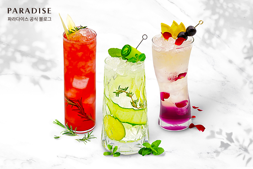 다음으로 소개할 미식은 맛과 건강 그리고 환경을 생각하는 마음까지 모두 담은 파라다이스시티 라운지 파라다이스의 친환경 힐링 코디얼 음료입니다. 라운지 파라다이스만의 친환경 레시피로 만든 코디얼 음료는 전통 K-식재료와 꽃, 그리고 다양한 색을 지닌 티의 어우러짐이 돋보이는 음료인데요.