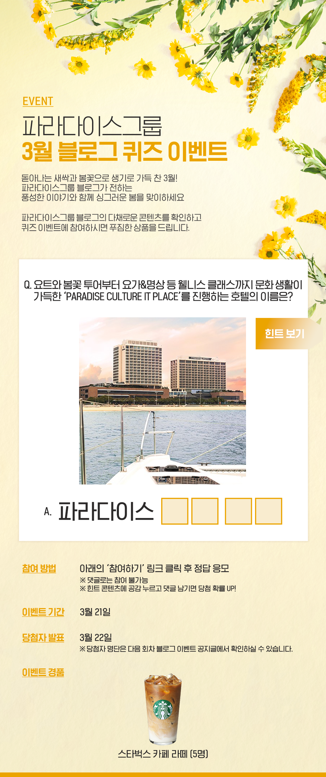 | 파라다이스그룹 3월 블로그 이벤트 (1회차) (53) | 2024.03.18 |