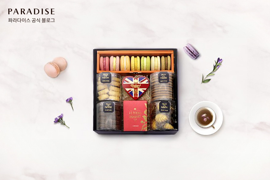 -구성: 파라다이스 마카롱 7구 세트 + 샤르보넬워커 하트 초콜릿 + 에디션 덴마크 허브티 1종 + 파라다이스 수제 쿠키 4종