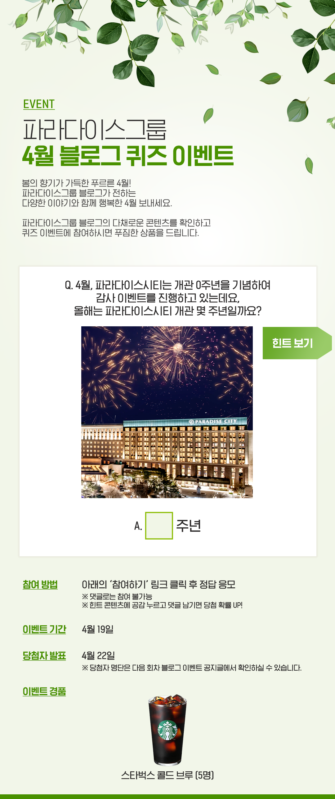 파라다이스그룹 4월 블로그 이벤트 (3회차) & 2회차 당첨자 발표 (49) | 2024.04.17 |