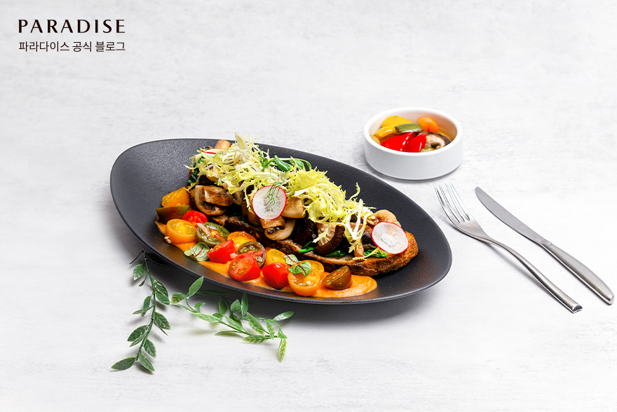 이번에는 파라다이스시티의 라운지 파라다이스로 넘어가 보겠습니다. 품격 있는 다이닝을 즐길 수 있는 이 곳에도 비건 미식이 준비되어 있습니다. 바로 향긋한 버섯 볶음과 선드라이 토마토 퓨레를 곁들인 머쉬룸 사워도우 타르틴인데요.