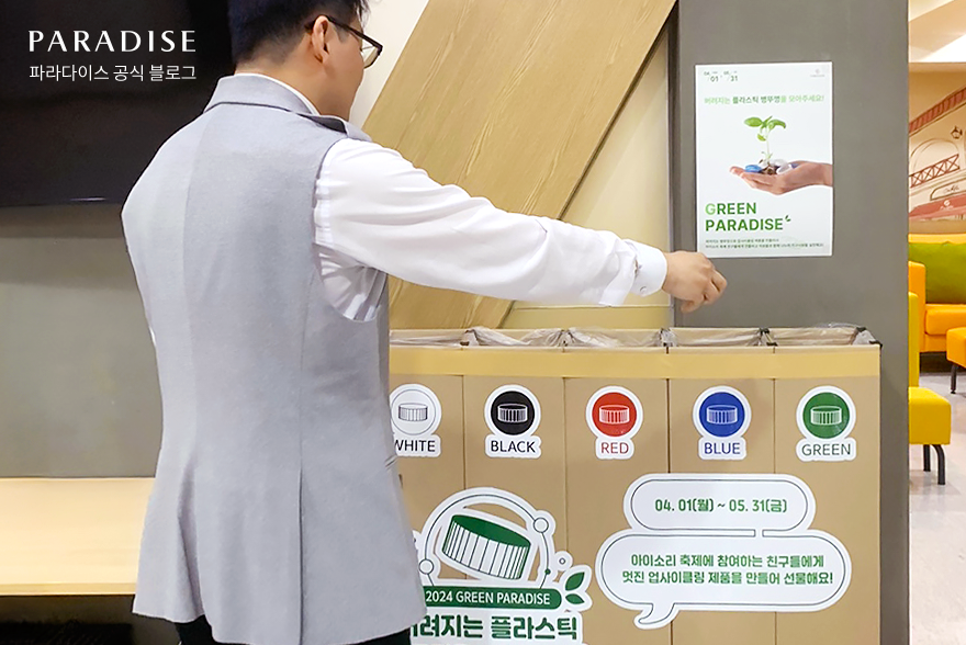지난 1일부터 파라다이스그룹은 친환경 소비 실천과 나눔 문화 확산을 위해 '그린 파라다이스' 캠페인을 전개하고 있습니다. 임직원들은 5월 4일 열리는 ‘아이소리축제’에 업사이클링 굿즈를 기부하기 위해 버려지는 병뚜껑 모으기에 동참하고 있는데요. 서울에 위치한 파라다이스 카지노 워커힐부터 인천 영종도의 파라다이스시티, 충남 스파 도고, 파라다이스 호텔 부산, 그리고 파라다이스 카지노 제주까지! 전국 사업장 곳곳에서 건강한 지구를 지키기 위해 파라다이스가 펼치는 작은 실천의 현장을 함께 만나볼까요?