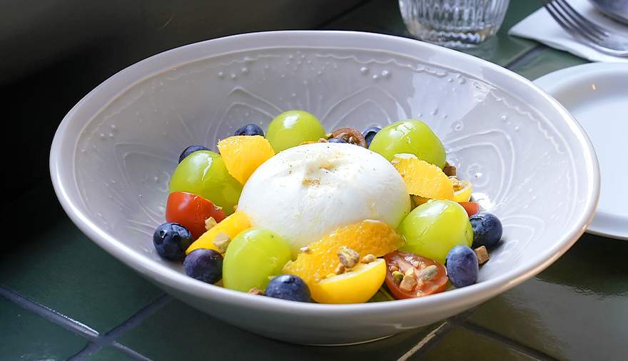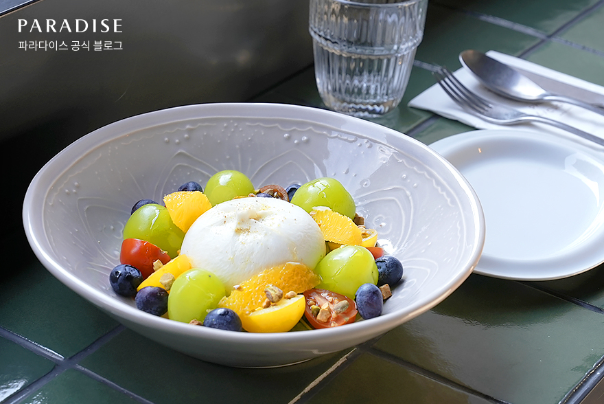 신선한 과일이 듬뿍 들어간 빠니에 리슈의 부라타 치즈 샐러드