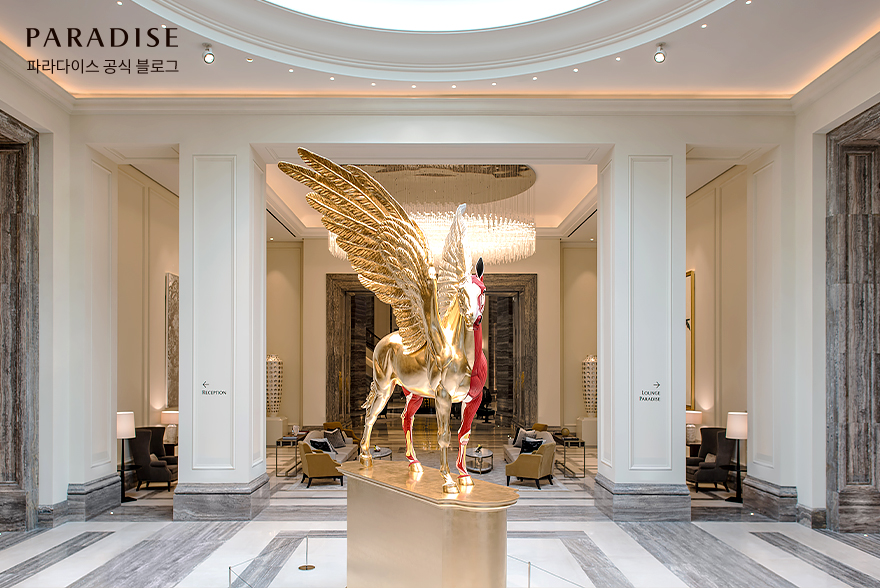깊이 있는 작품 감상이 가능한 아트 도슨트 투어도 준비되어 있습니다. 전문 도슨트와 함께 파라다이스 시티 곳곳의 예술 작품을 감상할 수 있는데요. 신화 속의 날개 달린 말 ‘페가수스’를 황금빛 근육질의 말로 형상화한 데미안 허스트의 ‘Golden Legend’를 시작으로 하우메 플렌자의 ‘Anna B. in Blue’, 김호득의 ‘Valley’, 박서보의 ‘ECRITURE NO. 110326’, 김창열의 ‘Waterdrops’ 등 다양한 작품에 대해 파라다이스시티의 전문 큐레이터의 심도 높은 해설을 들을 수 있답니다.