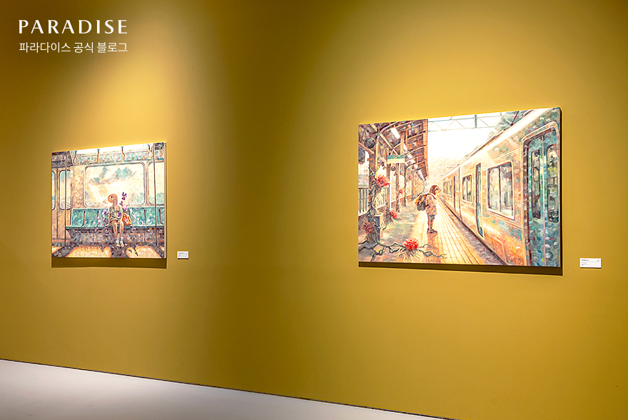 1층에서 현실적인 공간에서 비현실적 캐릭터를 담아낸 박용재 작가와 전준엽 작가의 작품을 감상했다면 이번에는 2층으로 올라와 비현실적 공간에서 현실적 캐릭터를 표현하는, 제이드 킴 작가의 작품을 감상할 차례입니다.