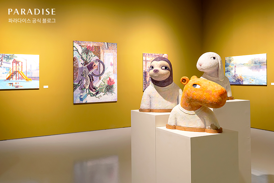'DROP DOT: 비현실적 현실을 만드는 사람들'展에서는 박용재 작가의 회화 작품 22점, 조형물 작품 20점이 전시되어 있습니다. 유년기 시절 꿈 속에서 자유로웠던 나와 현실에서의 나를 접목한 박용재 작가의 작품을 감상하면, 몽롱함에 이끌려 마치 그림 속으로 끌어당겨지는 듯한 기분까지 느껴지는데요.