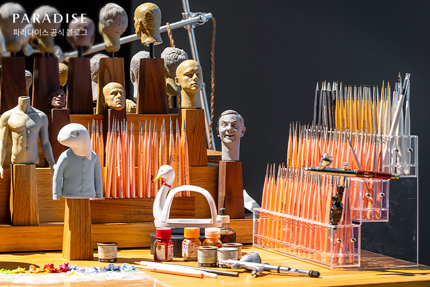 박용재 작가의 극사실 조형 작품들을 감상할 수 있는 공간도 구성되어 있는데요. 금방이라도 살아 움직일 것 같은 정교한 작품들 사이 창작의 과정을 엿볼 수 있는 작업 공간 또한 마련되어 있습니다. 이곳에서는 ‘조형적 현실’과 ‘회화적 비현실’ 2개의 공간을 넘나들며 작업을 이어가는 박용재 작가의 삶까지 마치 작품처럼 느껴지곤 합니다.