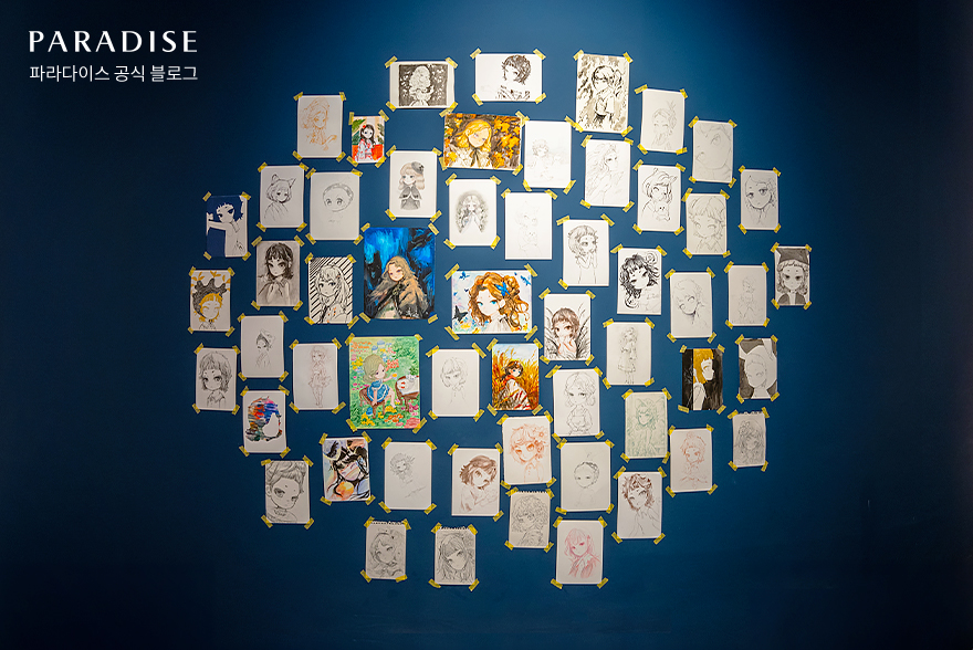 2층 전시장 한 켠에는 제이드 킴 작가의 스케치를 엿볼 수 있는 공간도 있습니다. 작가가 알지 못하는 아내의 어린 시절의 경험과 그녀의 성격과 취향, 그녀와 나눈 대화, 그녀가 좋아했던 것들을 시각적 판타지로 표현하기까지의 과정을 엿볼 수 있는데요. 작가의 작업물을 하나하나 살펴보다 보면 마치 현실적 캐릭터가 비현실적 공간으로 융화되는 과정을 간접적으로 느낄 수 있습니다.
