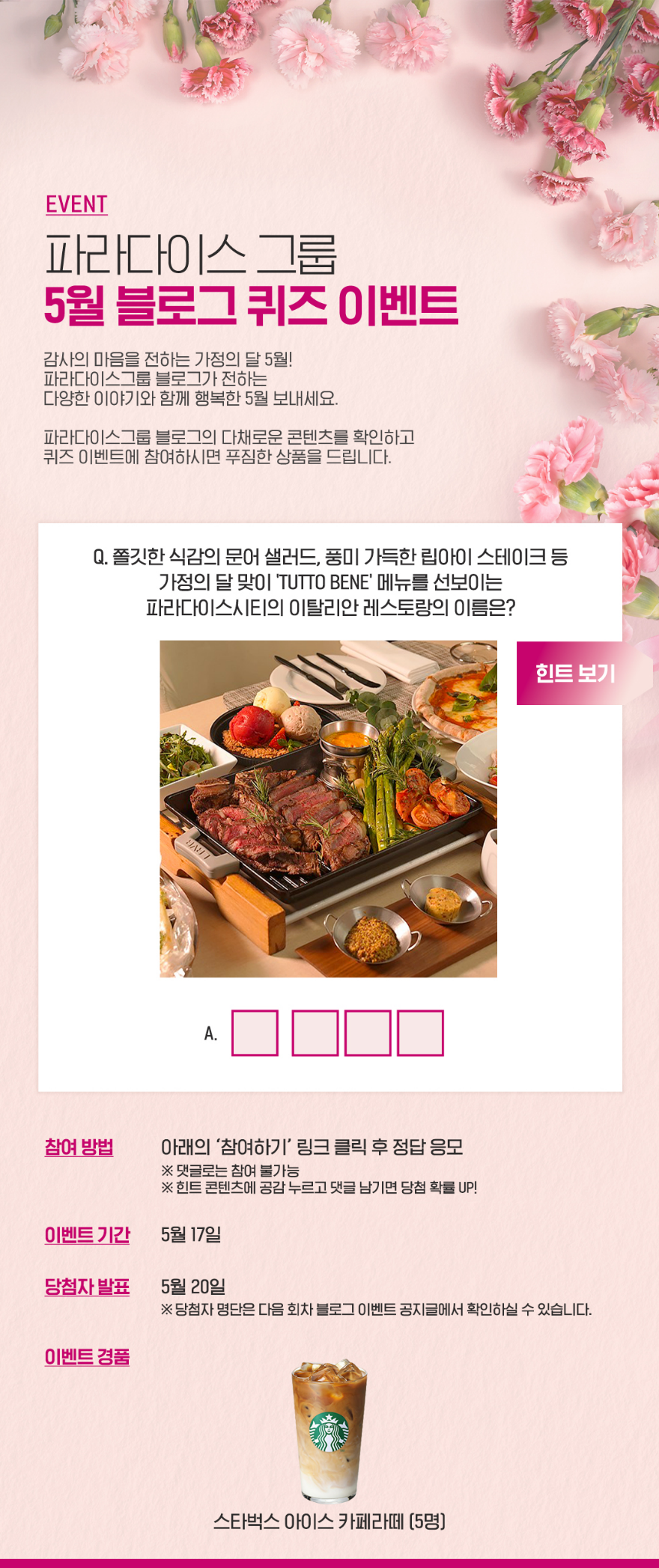 | 파라다이스그룹 5월 블로그 이벤트 (5회차) & 4회차 당첨자 발표 (68) | 2024.05.20 |