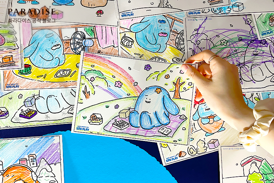 이후 스토리존 뒤편에 마련된 ‘쓱싹쓱싹 컬러링 체험’존으로 이동했는데요. 이곳에서는 지구에서 사계절을 보내는 조이의 컬러링 엽서를 골라 색칠하는 미션이 있었습니다. 봄 엽서를 선택한 저는 조이의 봄날이 더욱 화사해지도록 🎨알록달록하게 색칠해주고, 🌈무지개까지 그려 넣으며 미션을 완벽하게 마무리했죠.