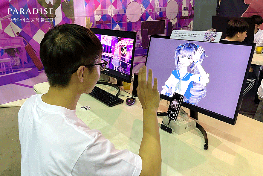 모니터 앞에 앉은 후, 계원예술대학교에서 만든 VR캐릭터와 처음 마주했는데요. 특수 카메라가 저의 행동과 표정을 인식하고, 캐릭터가 똑같이 표현하는 모습이 매우 흥미로웠습니다. 실제로 한 손으로 인사하거나, 양손으로 브이하는 모습 외에도 윙크하는 표정까지 그대로 구현하는 모습을 보니 탄성이 저절로 흘러나왔습니다.🧑💻