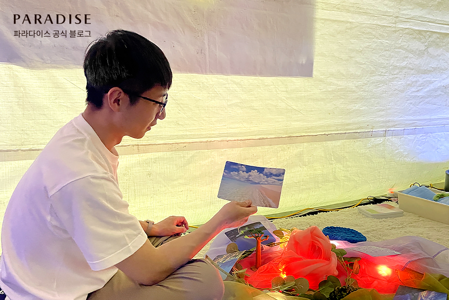 드넓은 바다와 함께 펼쳐진 하늘 사진을 선택한 저는 물방울💧, 파도 소리🌊, 바다 바람🌬️ 등과 같은 오감을 자극하는 소품을 통해 마음이 차분해지는 이너피스를 경험했습니다. 동시에 눈을 지긋이 감고 가장 행복했던 순간을 떠올려보라는 스텝의 한마디에 문득 푸른 바다가 아름다운 파라다이스 카지노 제주로부터 최종 합격 통보를 받았던 순간이 떠올랐는데요. 스누젤렌 체험을 통해 잠시 잊고 있었던 기분 좋은 순간을 떠올리며 나만의 해피 메모리를 만끽했습니다.