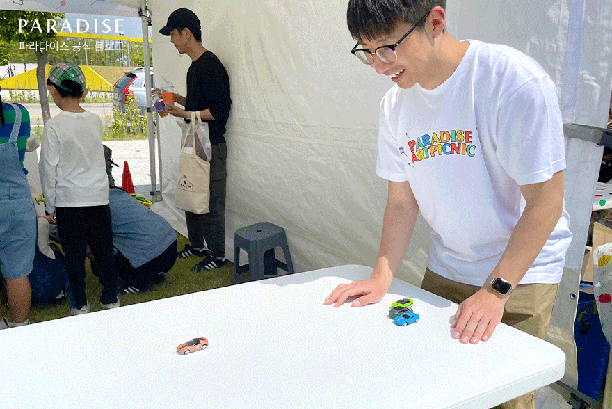 20년 만에 다시 만져본 미니카. 결승선에 무사히 도착하기를 바라며 떨리는 마음으로 힘차게 밀어보았는데요. 아슬아슬하게 목표 지점을 통과하자 주변 아이들의 환호성이 터지고 함께 즐거워하며 성공의 기쁨은 배가 되었습니다. 작은 장난감 하나로 행복해하는 아이들과 순수한 어린 시절의 동심으로 돌아가 절로 미소가 지어지는 순간이었습니다.
