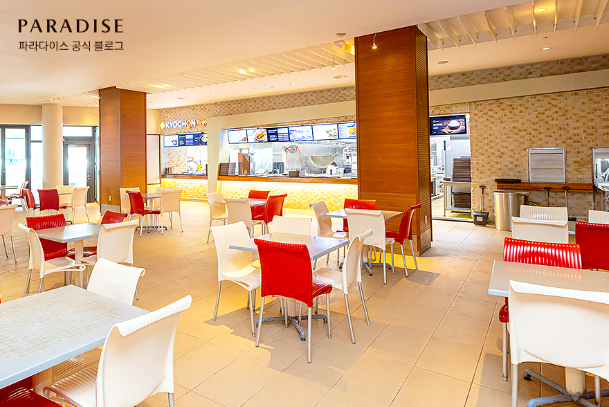 마지막으로 리뉴얼 된 장소도 궁금하시죠? 프리미엄 푸드코트에 화이트 톤 디자인을 적용해 더욱 쾌적하고 고급스럽게 바뀌었습니다! 뿐만 아니라 철저한 위생을 위해 수저 살균소독기, 정수기, 셀프바 등을 교체하여 한층 더 편안한 식사를 즐길 수 있습니다.