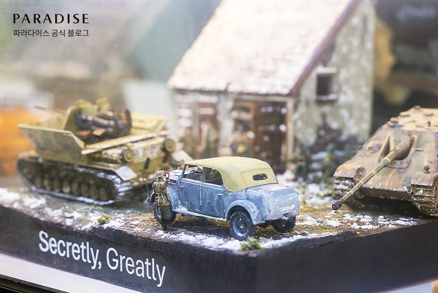 선정된 작품들은 ‘2024 TMAC’ 기간동안 파라다이스시티 플라자에서 경기와 함께 전시가 되었습니다. 미니카 경기 외에도 다양한 플라모델 전시품을 관람할 수 있어, 관객들의 만족도가 높았습니다. 플라모델은 모형이라고 믿기 힘들 정도의 정교함을 자랑했는데요. 고양이, 돼지 등 다양한 동물과 전차, 스포츠카 모형들이 실제와 같은 디테일을 보여주었습니다. 특히 작품명 ‘Secretly, Greatly’는 디테일과 더불어 탄탄한 스토리라인으로 관객들의 시선을 끌었는데요. 세계 2차 대전 당시 연합군과 독일군의 아슬아슬한 대치를 플라모델로 표현하여 모형에도 불구하고 긴장감을 느낄 수 있는 작품이었습니다.