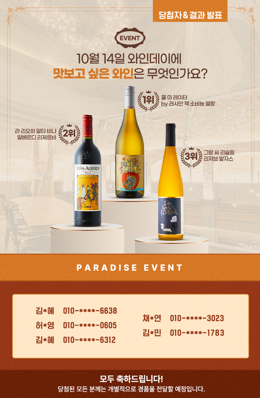 완연한 가을 날씨가 느껴지는 10월입니다. 지난 주 비노파라다이스 와인 3종 중 가장 맛보고 싶은 와인을 선택하는 이벤트를 진행했는데요. 많은 분들에게 선택받은 제품은 과연 무엇이었을까요? 순위 공개와 함께 행운의 당첨 주인공을 발표합니다! 얼마 남지 않은 가을, 계절의 정취를 더해 줄 파라다이스의 와인과 함께해보세요.