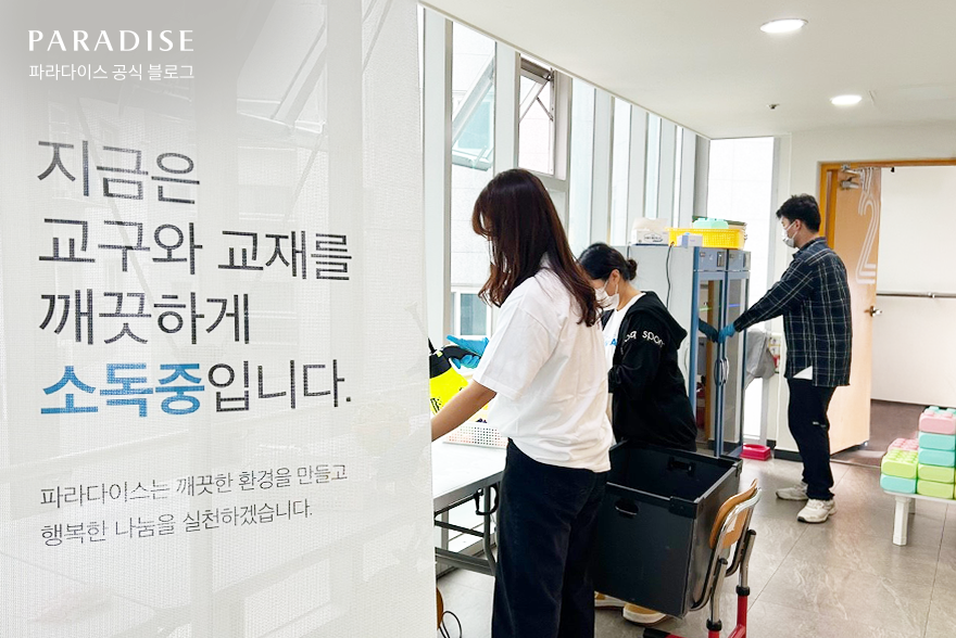 복지관에 도착한 파라다이스 복지재단 임직원들은 안전한 치료 환경 조성을 위한 청소에 나섰습니다. 에어건을 사용해 불순물을 제거하고, 스팀 기기와 제균 용품 등으로 세척한 후 오존 살균 처리까지 꼼꼼하게 진행했는데요. 전문 장비를 활용한 본격적인 살균 작업 덕분에 복지관 구석구석이 점점 깨끗하게 변해갔습니다.