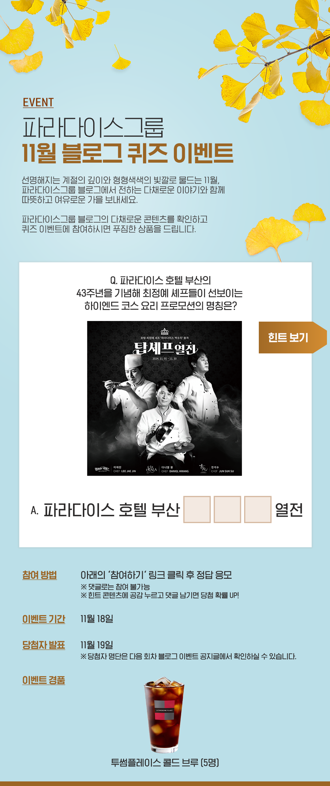 | [11월 사보 이벤트] 파라다이스 호텔 부산 창립 기념 퀴즈 EVENT! (7) | 2024.11.04 |