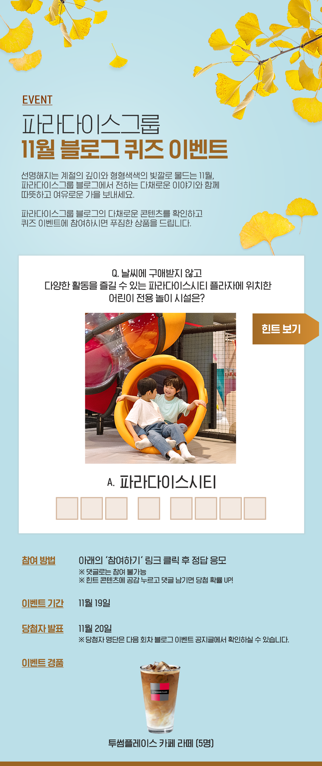 | 파라다이스그룹 11월 블로그 이벤트 (1회차) (19) | 2024.11.18 |
