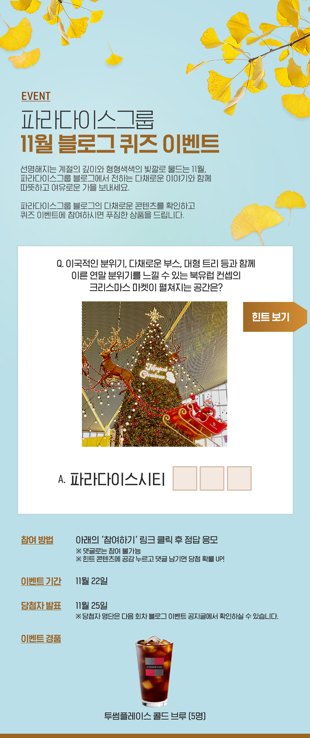 | 파라다이스그룹 11월 블로그 이벤트 (2회차) & 1회차 당첨자 발표 (16) | 2024.11.19 |