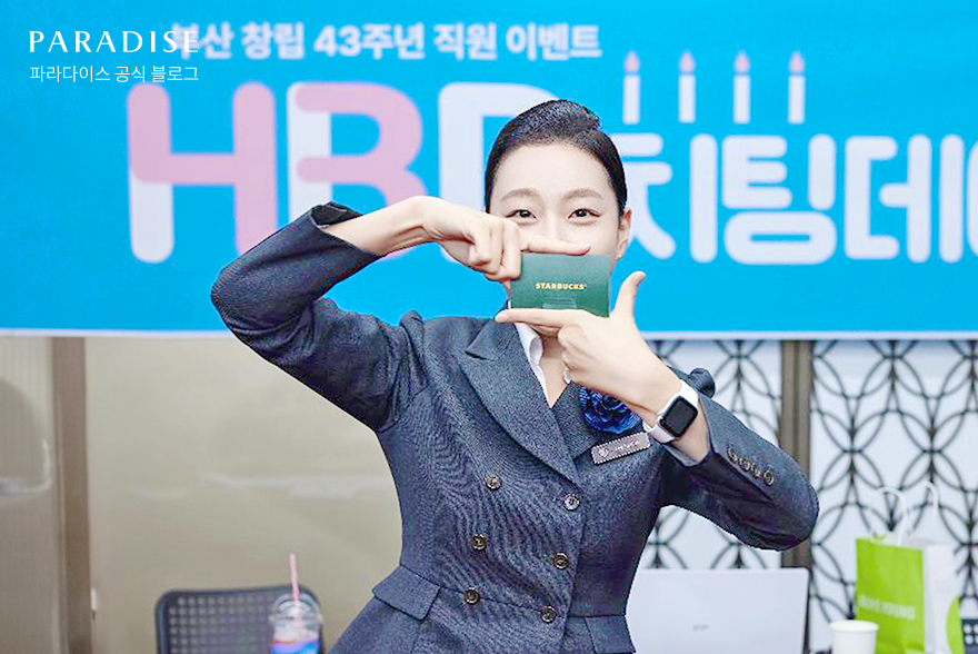 동료들의 웃음과 응원으로 가득했던, 하루 동안 알차게 펼쳐진 파라다이스 호텔 부산의 치팅데이 어떠셨나요? 행복 에너지를 가득 채우고 44주년을 향해 걸음을 내딛고 있는 파라다이스 호텔 부산 가족들에게 응원을 보내주세요. 지금까지 파라다이스 호텔 부산의 소식을 전하는 앰버서더 이동선이었습니다.
