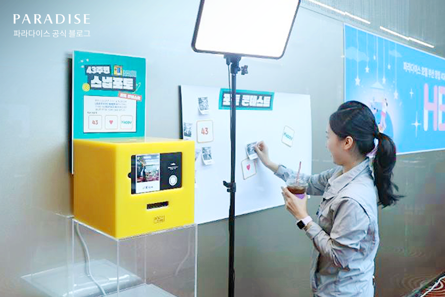 치팅데이의 소중한 추억을 남길 수 있는 스냅 포토 이벤트도 진행되었습니다. ’43’, ‘Happy’, ‘하트’를 키워드로 자유롭게 사진을 찍으면 3초만에 인쇄된 영수증 스냅 포토를 받을 수 있었는데요. 베스트 사진을 뽑는 포토 콘테스트도 진행하고 있어 저도 참여해 보았습니다. 동료들과 함께 웃으며 찍은 사진들은 행복한 추억으로 남았습니다.
