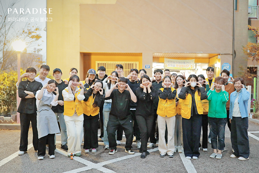 파라다이스시티의 마동석! 브랜드 앰버서더 이승훈입니다. 파라다이스시티 봉사 동호회 ‘파라다이스 밥상(이하 ‘파라 밥상’)’은 ‘따뜻하고 끈끈한, 인간미까지 느껴지는 아름다운 동행’을 실천하고 있습니다. 파라 밥상은 파라다이스시티 새라새 이성일 헤드 쉐프(동호회장)와 조리팀 소속 20여 명 등 총 60명의 직원이 선한 뜻을 나누고자 모인 봉사 동호회인데요. 지난 9월에 이어 인천 유일의 아동 일시보호시설인 ‘인천 보라매아동센터’에서 한 번 더 따뜻한 한 끼를 선사하며 나눔을 이어가고자 다시 뭉쳤습니다.