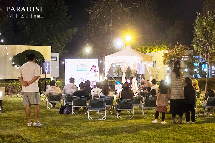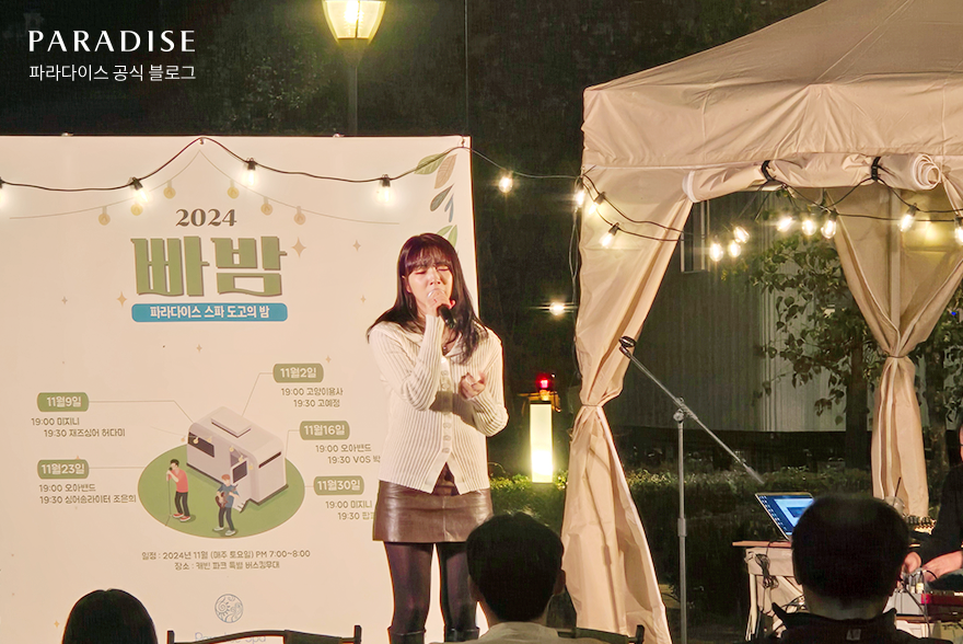 지난 6월 새롭게 오픈한 파라다이스 스파 도고의 캐빈 파크에서는 11월 매주 토요일 밤, 오픈 기념 버스킹 공연 ‘빠밤’이 열리고 있습니다. 깊어가는 가을밤의 정취를 한껏 느낄 수 있는 이 행사는 캐빈 파크 내 잔디밭에서 진행되어 낭만적인 분위기를 선사합니다.