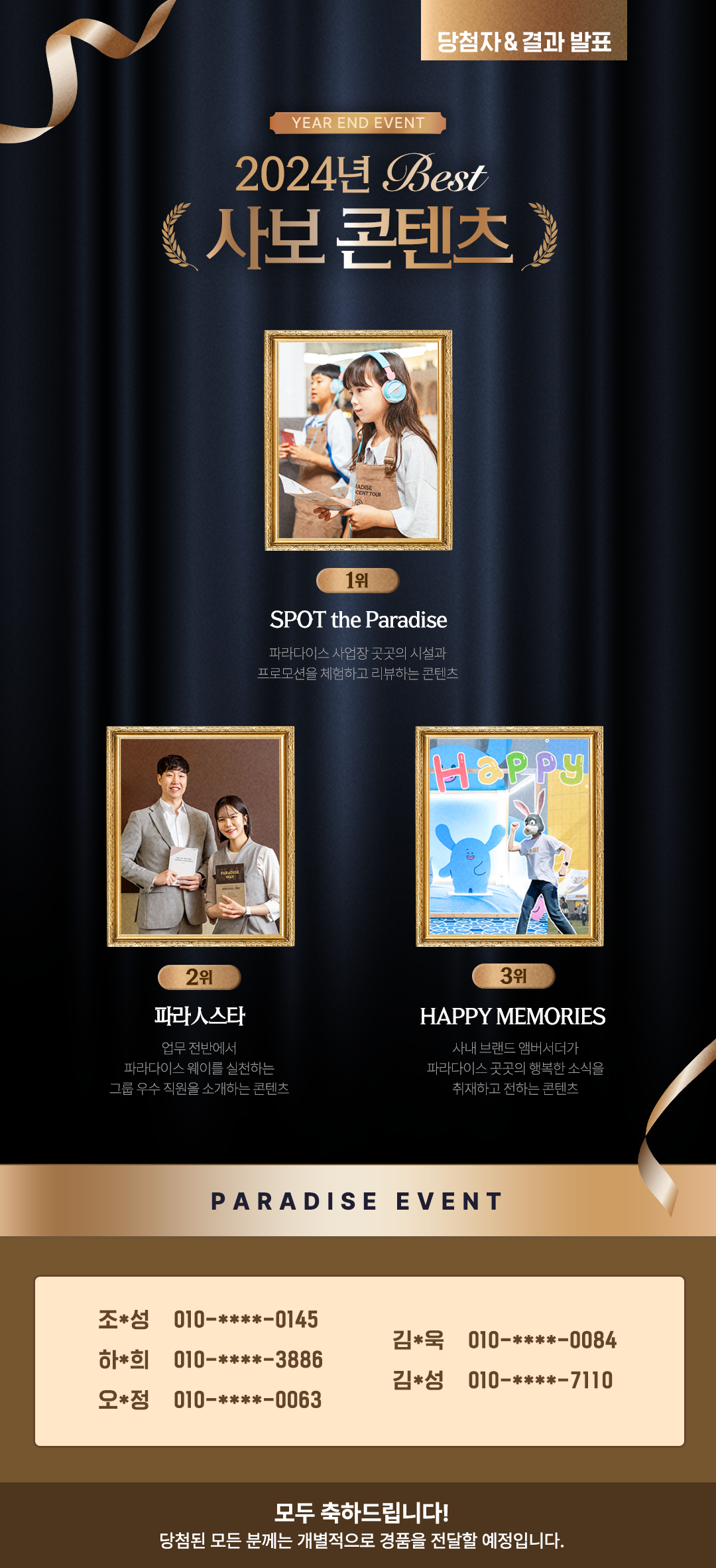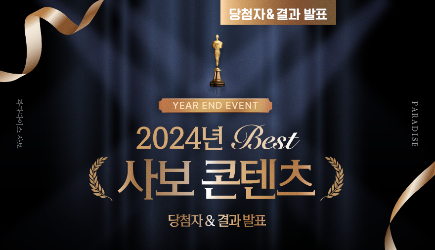 | 파라다이스그룹 12월 블로그 이벤트 (2회차) & 1회차 당첨자 발표 (36) | 2024.12.17 |