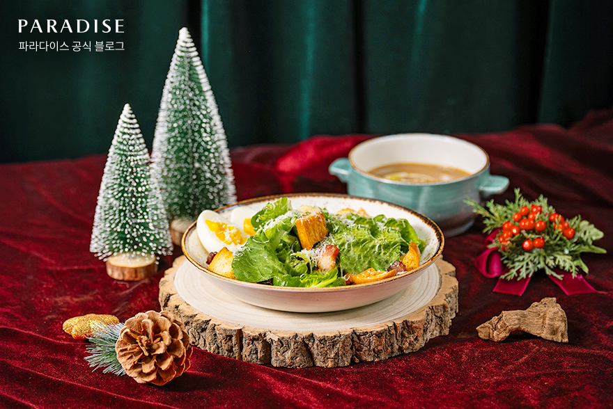 ‘로메인 시저 샐러드’는 싱싱한 로메인이 아삭한 식감으로 입안 가득 싱그러움을 전하는데요. 새콤한 맛으로 야채와 잘 어울리는 시저 소스와 바삭한 고소함의 베이컨, 부드러운 계란, 짭짤한 감칠맛의 파마산 치즈가 고급스러운 연말 분위기를 더합니다.