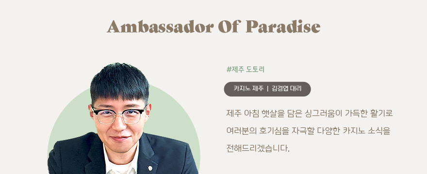안녕하세요. 따스한 겨울을 맞이하고 싶은 파라다이스 카지노 제주의 브랜드 앰버서더 김경엽입니다. 파라다이스그룹 사옥에는 배려와 친환경 철학이 함께 담긴 뜻깊은 공간이 있다는 사실, 알고 계셨나요? 잠깐의 방문으로도 잊을 수 없는 추억으로 남았던 사내 카페에서의 친환경 체험기, 지금부터 들려드리겠습니다.