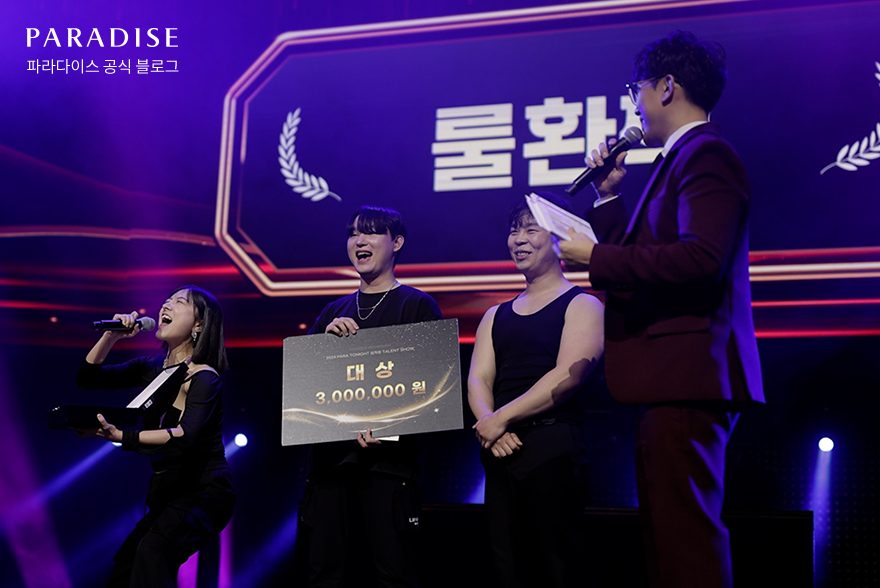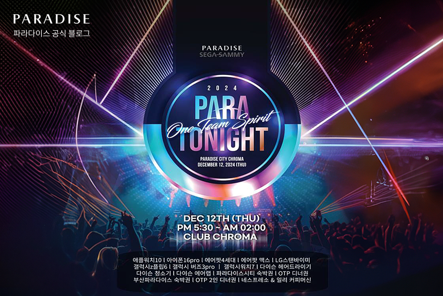지난 12월 12일, 파라다이스시티 클럽 크로마에서 임직원 송년회 ‘PARA TONIGHT’이 성황리에 막을 내렸습니다. 이번 행사는 ‘자부심, 그리고 새로운 도약’이라는 주제로, ONE TEAM 사진전 영상 상영, 임원진의 유쾌한 댄스 축하 공연, 열정 가득한 15팀의 직원이 펼치는 장기자랑, 그리고 초대가수 국카스텐, 효린의 특별 공연으로 꾸며졌습니다.