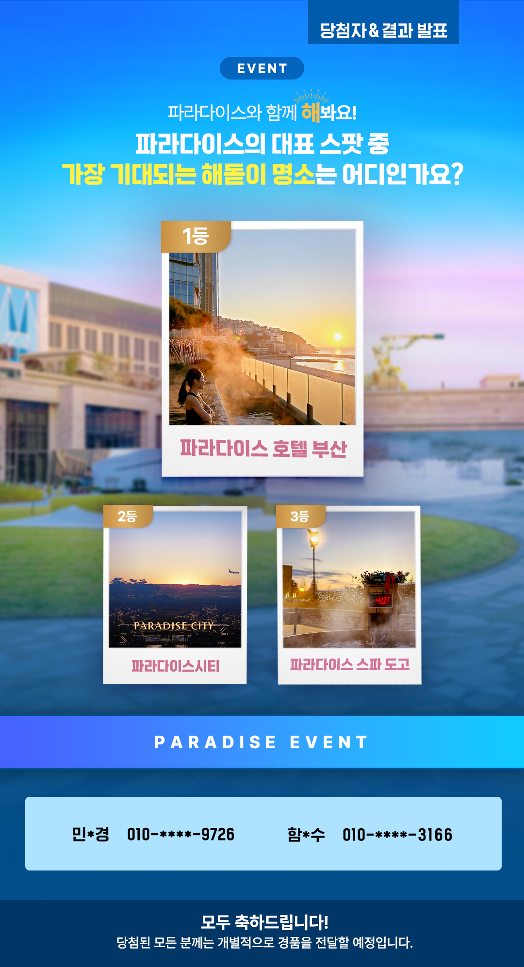 새해를 맞이하는 설렘 속에서, ‘가장 기대되는 파라다이스의 해돋이 명소’ 투표 이벤트가 많은 분들의 참여와 관심 속에 종료되었습니다. 파라다이스시티, 파라다이스 호텔 부산, 파라다이스 스파 도고 중 파라다이스의 대표적인 해돋이 명소로 선택된 장소는 어디일까요? 새해의 첫 아침을 물들이는 장엄한 일출처럼, 희망찬 한 해가 되시기를 바라며, 이제 투표 결과와 함께 행운의 주인공을 발표합니다.