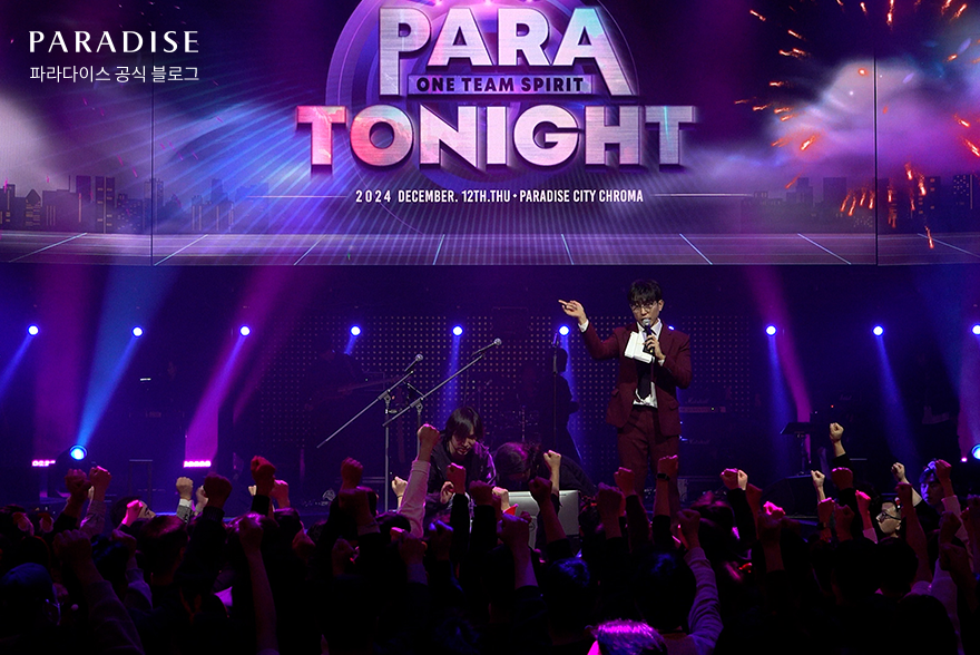 지난 연말, 파라다이스시티 클럽 크로마를 뜨겁게 달군 행사가 열렸습니다. 바로 파라다이스시티 임직원 송년회 ‘PARA TONIGHT(이하 ‘파라투나잇’)’인데요. 2024년 2회째를 맞은 파라투나잇은 임직원들의 열띤 성원에 힘입어 파라다이스의 대표적인 사내 행사로 자리 잡았습니다. 약 1,000명이 참여한 대규모 행사였지만, 세심한 기획 덕분에 모두가 하나되어 뜻깊은 시간을 보낼 수 있었습니다.