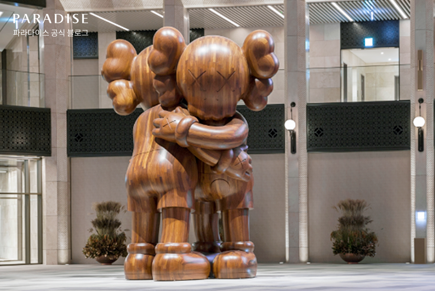 파라다이스시티 플라자는 다채로운 다이닝, 카페, 그리고 독특한 편집숍으로 가득한 매력적인 공간입니다. 그중에서도 방문객의 눈길을 사로잡는 대표적인 작품은 거대한 조형물 카우스(KAWS)의 ‘Together’입니다. 카우스는 미국을 대표하는 예술가이자 디자이너로, 자신만의 독창적인 캐릭터는 물론 유명 캐릭터에 시그니처 ‘xx’를 더하며 독보적인 예술 세계를 구축해 왔습니다.