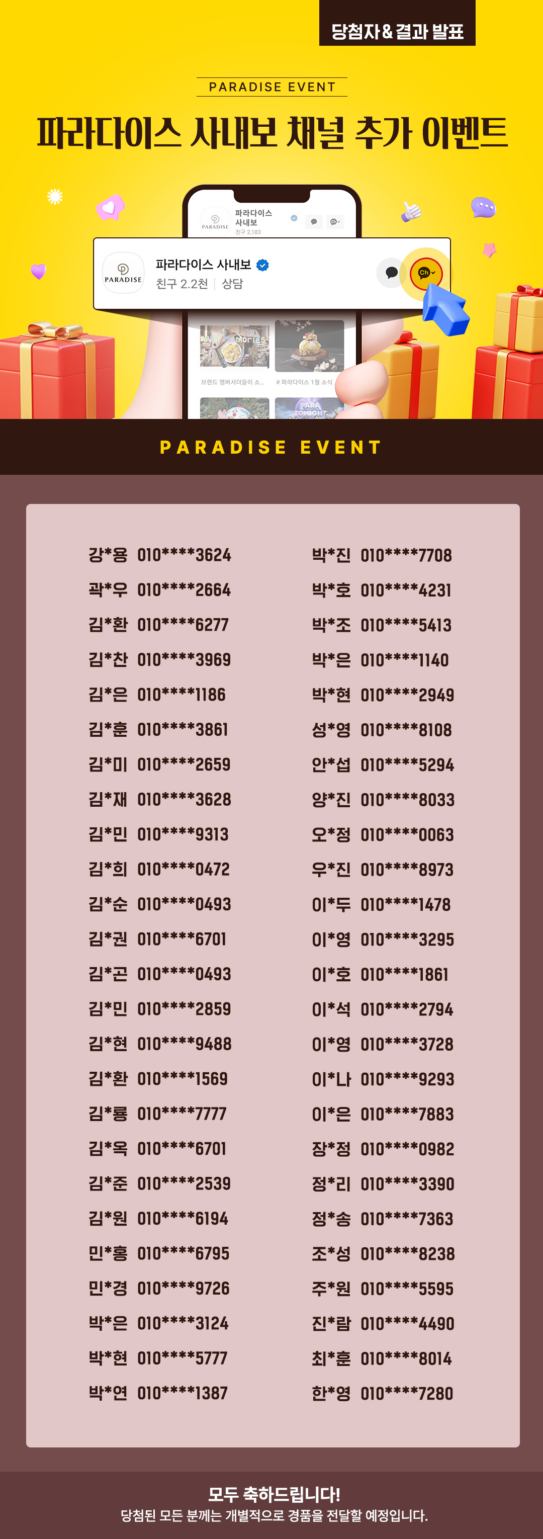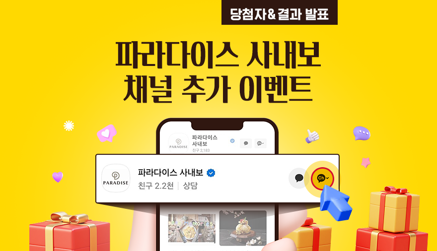 파라다이스 사내보 카카오톡 채널 추가 이벤트 당첨자 발표!