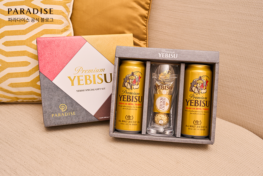 -구성: YEBISU 스페셜 기프트 세트 (YEBISU 500ML 맥주 2캔, 전용 글라스 1EA, 페레로 로쉐 3구)