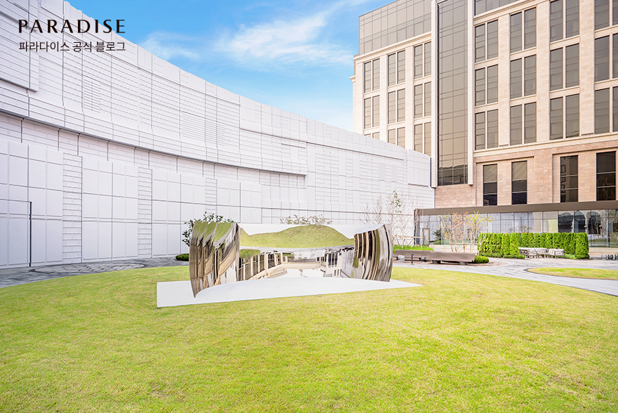 파라다이스시티를 방문하신다면 따뜻한 봄의 정취를 가득 느낄 수 있는 ‘히든 시크릿 코스’를 만나 보시길 바랍니다. 각 스팟이 하나로 연결되어 있어 산책 코스를 거닐듯 전체 시설을 여유롭게 감상할 수 있는 것이 포인트인데요. 메인 호텔과 플라자 광장 사이에 위치한 정원, 아트 가든에서는 공간과 완벽하게 어우러지는 조각 설치 작품을 만날 수 있습니다. 스테인리스 스틸 표면에 주변 풍경과 관람객을 거꾸로 반사시켜 보여주는 아니쉬 카푸어의 ‘C-CURVE’, 그리고 일상적인 주방용품을 쌓아 만든 거대한 크기의 조각작품 수보드 굽타 ‘WHEN IT RAINS’를 감상해 보는 건 어떨까요? 고요함 속에서 작품이 전하는 메시지를 생각하며 사색에 잠기는 여유로운 시간을 향유해 보시길 바랍니다.
