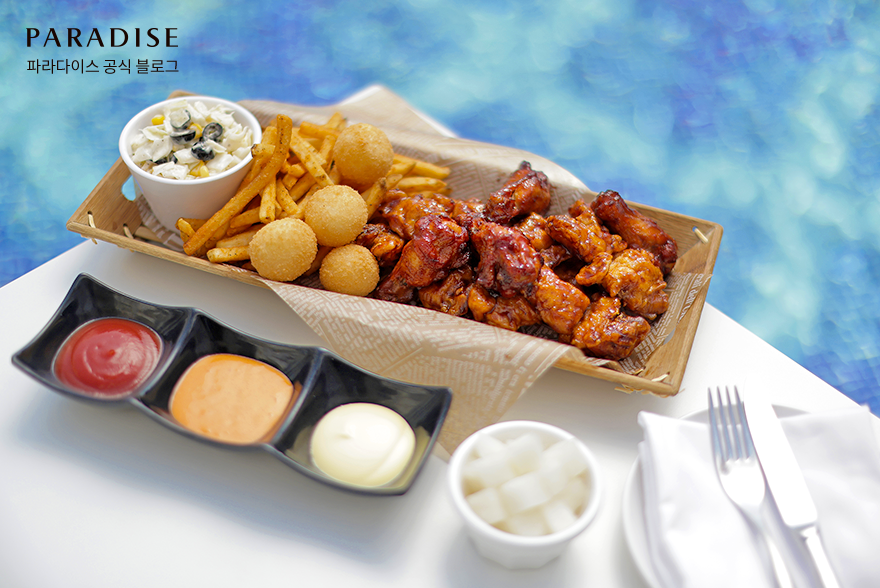 즐거운 물놀이 후에는 맛있는 미식이 빠질 수 없죠. 씨메르 1층에 위치한 푸드 플라자에서 달콤 바삭한 치킨으로 허기진 배를 달래보시길 바랍니다. 푸드 플라자는 한식부터 양식, 아시안 푸드까지 다양한 세대와 취향을 고려한 음식을 제공하는 공간인데요. 이번 8주년 기념 프로모션으로 제공하는 순살 치킨은 후라이드와 갈비 양념 중 원하는 맛으로 선택할 수 있습니다. 바삭하게 튀겨진 치킨과 고소한 감자튀김&치즈볼, 그리고 상큼 아삭한 코울슬로도 함께 곁들여 보세요. 여유로운 스파 후 즐기는 든든한 메뉴로 오감 만족 휴식이 완성됩니다.