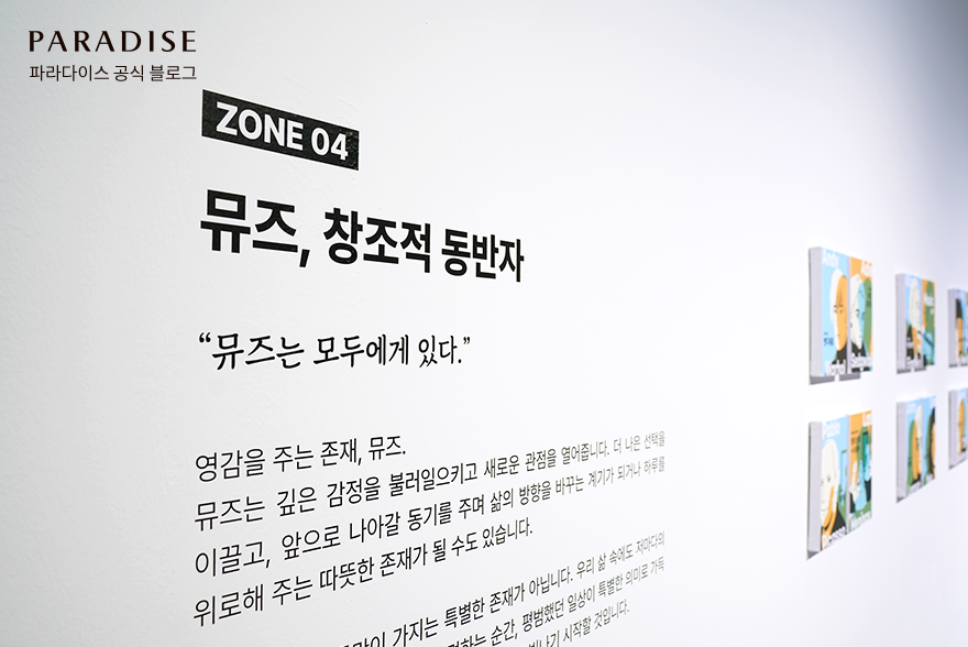 다음으로 만나볼 공간은 피카소, 플라톤, 존 레논 등 다양한 유명인의 뮤즈를 소개하는 코너, <뮤즈, 창조적 동반자>입니다. 예술가에게 영감을 주는 존재인 뮤즈는 필수적인데요. 깊은 내면의 감정과 새로운 관점을 동시에 선사하는 대상으로, 발견하는 순간 평범했던 일상이 특별하게 변합니다. 나에게 그런 존재는 누구인지 스스로에게 질문을 던져보면서 더욱 몰입하여 전시를 즐겨보세요.