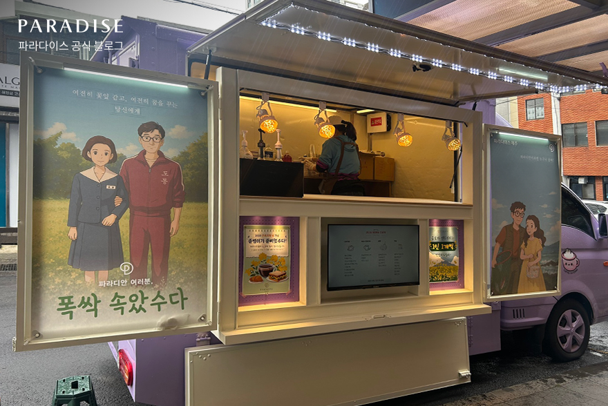5월 1일, 근로자의 날을 맞이해 파라다이스 제주 카지노에서는 임직원들의 사기를 북돋기 위한 특별한 커피차 이벤트가 열렸습니다. 애니메이션 속 캐릭터처럼 그려진 제주지점 본부장의 일러스트가 특히 눈길을 끌며 직원들의 발길을 사로잡았는데요. 그림 속에는 ‘파라디안 여러분, 폭싹 속았수다’라는 위트있는 제주 방언을 새겨 일상 속 작은 즐거움을 선사했습니다.