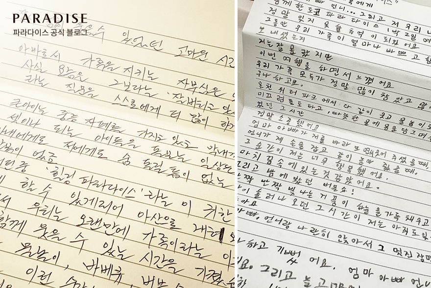 가족사진을 보며, 오늘 하루를 손 편지로 남겨보는 시간도 가졌는데요. 가족들이 써 내려간 편지에는 진솔한 마음이 가득했습니다. 집에서 매일 마주 보는 얼굴인데도 왠지 오늘만큼은 서로를 더 가깝게 들여다본 하루인 것 같습니다.