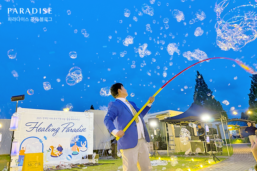 힐링 파라다이스에서 빠질 수 없는 이벤트, 버블쇼 시간이 찾아왔습니다. 커다란 비눗방울이 하늘로 떠오를 때마다 가족들은 손뼉을 치고 환호했습니다. 장애인 자녀를 둔 부모님들은 가족들과 외출하거나, 여행을 갈 때에도 혹시나 자녀가 주변에 피해를 주지는 않을까 노심초사, 마음 졸이는 것이 일상인데요. 이 시간만큼은 마음껏 춤도 추고, 환호하며 버블쇼를 즐길 수 있었습니다. 보는 사람의 마음까지도 편안해지는 풍경이었죠. 소중한 순간을 함께 즐기는 모습에서 힐링 파라다이스의 진정한 가치를 느낄 수 있었습니다.