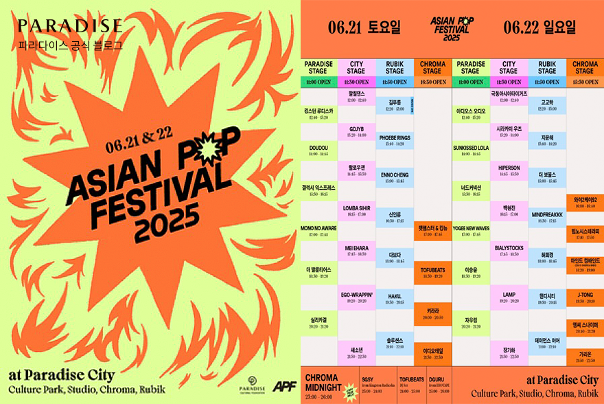 안녕하세요. 파라다이스 소식을 누구보다 발빠르게 전달하는 파라 커넥터 홍수연입니다. 지난 6월 21일과 22일 양일간, 파라다이스시티가 또 한 번 뜨겁게 달아올랐다는 소식인데요. 바로 아시안 팝 페스티벌 2025가 파라다이스시티에서 열렸기 때문입니다. 아시안 팝 신을 대표하는 K-POP, J-POP, C-POP은 물론 태국, 베트남, 인도네시아 등 동남아시아의 톱 아티스트들까지 한자리에 모인 대규모 글로벌 음악 축제였습니다.